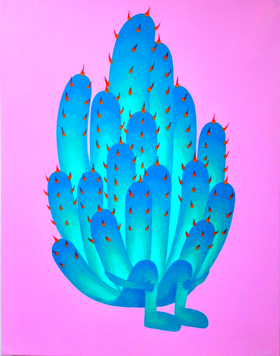 "업 주제는 콤플렉스를 계속 마주하며 스스로를 치유하는 과정이다. 평소 피부 상태를 외면하다가 상태가 악화되면 콤플렉스를 다시 깨닫게 되는 과정에서 더욱 큰 스트레스를 받아왔다. 이 주제가 정해질 때 피부는 외면할 수 없을 정도로 악화된 상태였다. 스트레스에서 벗어나기 위해 그림으로 피부를 표현하며 콤플렉스를 마주하기로 결심했다. 피부에 가시가 박힌 것 같은 따가움이 느껴졌고 움직일 때마다 갈라지는 것이 보였다. 따가움은 선인장과 가시로, 갈라지는 피부는 사막으로 표현했다."