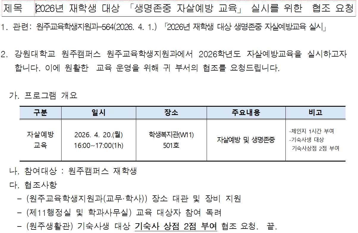 2026년 재학생 대상 「생명존중 자살예방 교육」 실시를 위한 협조 요청