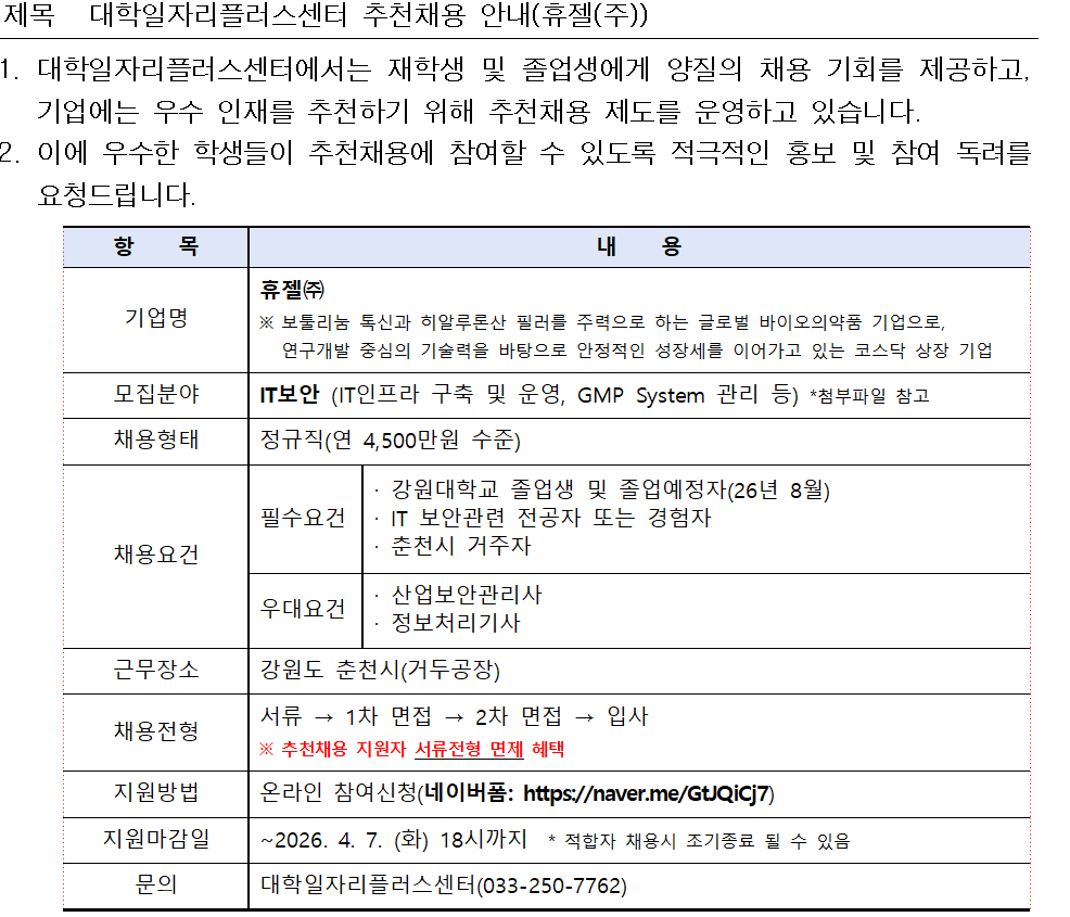 대학일자리플러스센터 추천채용 안내(휴젤(주))