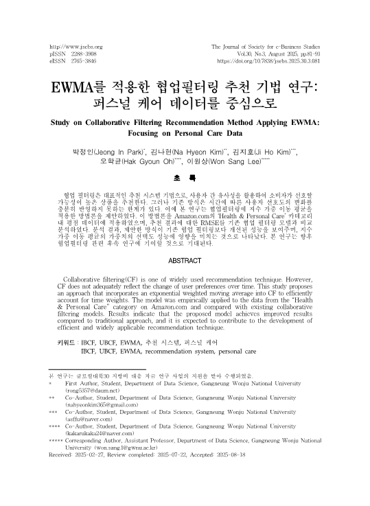 데이터사이언스학과 학부생 박정인, 김나현, 김지호, 오학균 학생이 「The Journal of Society for e-Business Studies」 2025년 8월호에 *“EWMA를 적용한 협업필터링 추천 기법 연구: 퍼스널 케어 데이터를 중심으로”*라는 논문을 게재하였습니다.