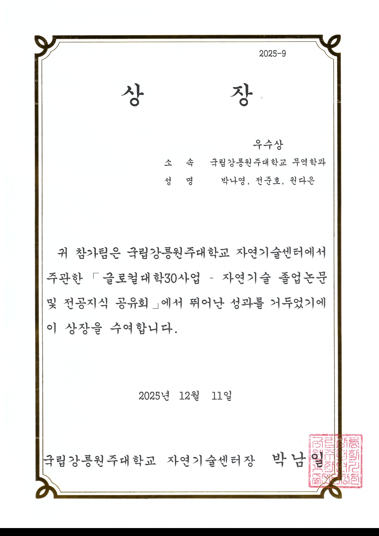 무역학과 박나영, 전준호, 권다은 학생 "글로컬대학30-자연기술 졸업논문 및 전공지식 공유회" 우수상 수상