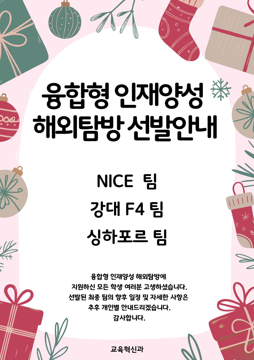 fnctId=bbs,fnctNo=1191 2025학년도 융합형 인재양성 해외탐방 최종선발 안내 작성일 2025.12.05 작성자 김경린 조회수 789 첨부파일 첨부파일이(가) 없습니다.