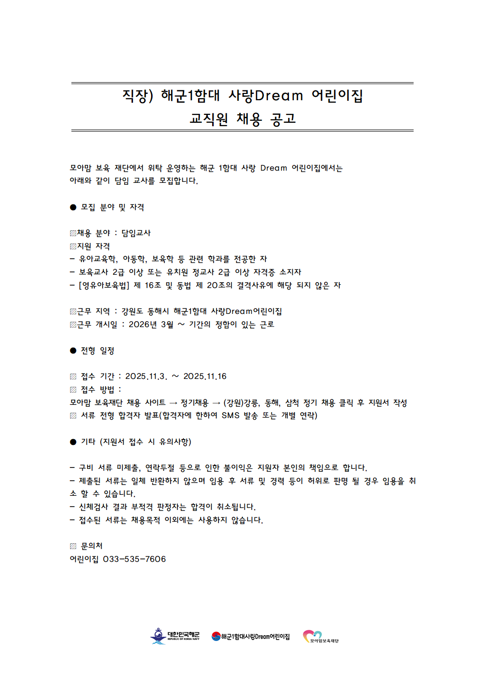 fnctId=bbs,fnctNo=208 해군1함대 사랑Dream 어린이집 교직원 채용 작성일 2025.11.10 작성자 신시원 조회수 1478 첨부파일 첨부파일이(가) 없습니다. 다음글 강릉원주대학교 해람어린이집 보육교직원 모집 공고 신시원 2025-11-17 14:27:43.0 이전글 2025학년도 봉대초등학교병설유치원 하계 방학 중 방과후과정 인력 채용 공고 신시원 2025-06-20 09:24:39.0 총 17 개의 게시물이 있습니다. 게시물 검색 제목 작성자 게시글 리스트 취업정보 번호 제목 작성자 작성일 댓글 조회수 첨부파일 17 한라소담 어린이집 정교사 모집 공고 신시원 2026.03.09 0 726 0 16 강원특별자치도자연학습원 직원 공개 채용 신시원 2026.01.12 0 1271 1 15 강릉원주대학교 해람어린이집 보육교직원 모집 공고 신시원 2025.11.17 0 1757 1 14 해군1함대 사랑Dream 어린이집 교직원 채용 신시원 2025.11.10 0 1478 0 13 2025학년도 봉대초등학교병설유치원 하계 방학 중 방과후과정 인력 채용 공고 신시원 2025.06.20 0 2819 0 12 하이원 정선 어린이집(강원랜드 직장어린이집(한솔보육재단)) 보육교사 채용 공고 신시원 2024.07.17 0 6474 0 11 <원주소방서어린이집 담임교사 구인> 신시원 2024.03.11 0 6432 0 10 근로복지공단 동해어린이집 보육교직원 채용 공고 신시원 2023.11.24 0 4638 0 9 푸른자연 유치원 교사 구인 안내 신시원 2023.08.14 0 2305 0 8 2023년 강릉원주대학교 해람어린이집 교사 채용공고 신시원 2022.12.14 0 2766 2 처음 12 1 2 다음 페이지 끝